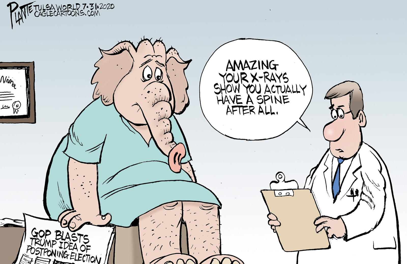 Tags/Keywords Campaign 2020, GOP blasts Trump, Grand Ol' Party, November 3, postponing election, President Donald J. Trump, Republican Party, FILE: Plante20200802 Reprint This CartoonBuy A PrintBuy The Original REPRINT THIS CARTOON Fill out the info below and I'll be in touch ASAP Your Name (required) Your Email (required) Details, Print, Digital, Circulation, etc. Please leave this field empty. BUY A PRINT OF THIS CARTOON Fill out the info below and I'll be in touch ASAP Your Name(required) Your Email(required) Details, Number of copies, Questions. Please leave this field empty. BUY THE ORIGINAL Originals may or may not be available. Fill out the info below and I'll be in touch ASAP Your Name (required) Your Email (required) Your Message Please leave this field empty.