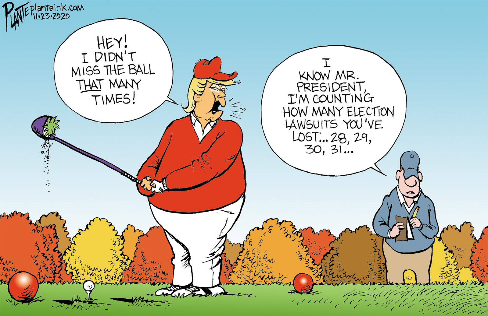 Tags/Keywords 2020 election results, election lawsuits, no consession, President Donald J. Trump, President-elect Joe R. Biden, Rudy Giuliani, Trump tees off, FILE: Plante20201123 Reprint This CartoonBuy A PrintBuy The Original REPRINT THIS CARTOON Fill out the info below and I'll be in touch ASAP Your Name (required) Your Email (required) Details, Print, Digital, Circulation, etc. Please leave this field empty. BUY A PRINT OF THIS CARTOON Fill out the info below and I'll be in touch ASAP Your Name(required) Your Email(required) Details, Number of copies, Questions. Please leave this field empty. BUY THE ORIGINAL Originals may or may not be available. Fill out the info below and I'll be in touch ASAP Your Name (required) Your Email (required) Your Message Please leave this field empty.