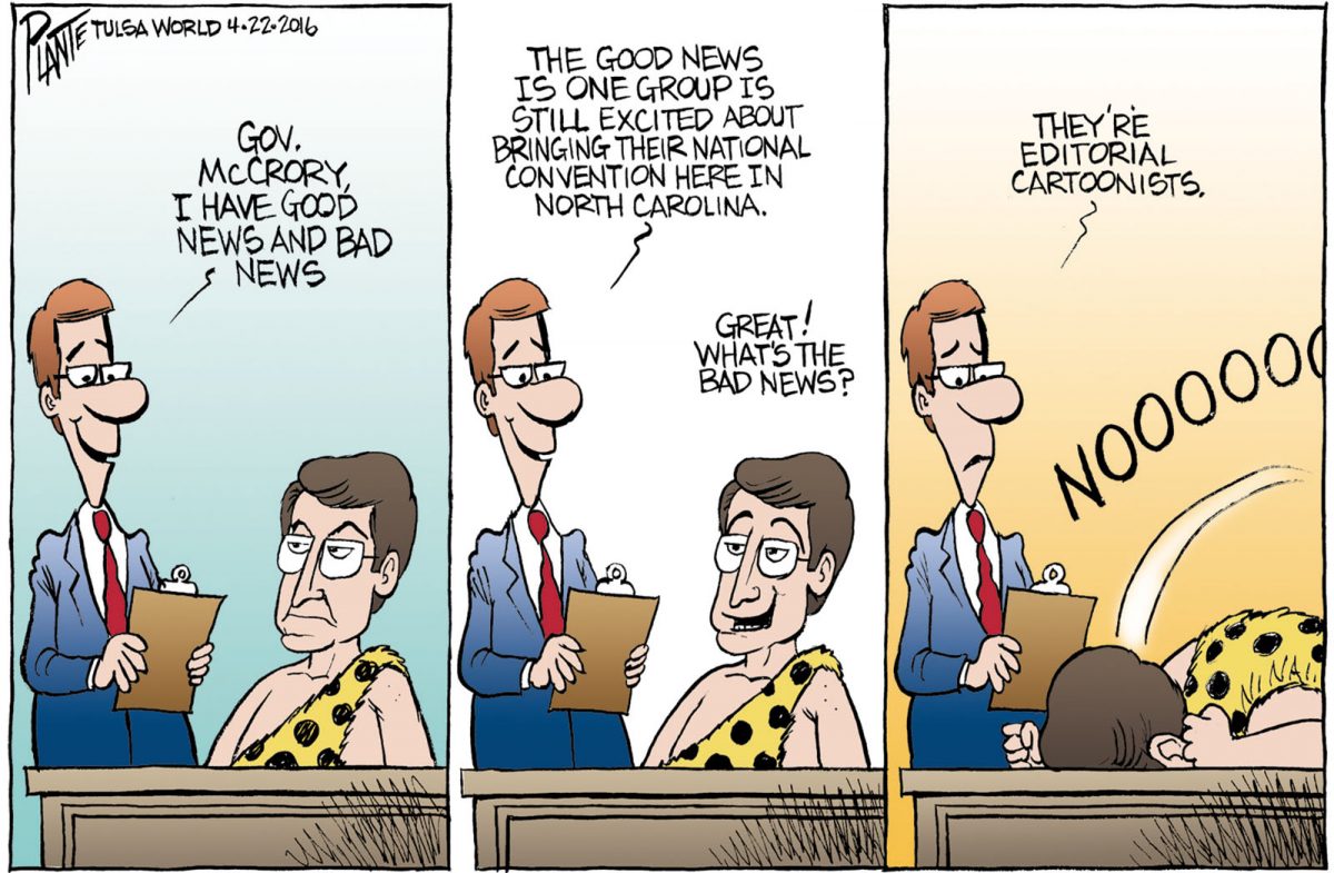 Conventioning in North Carolina,Conventioning in North Carolina, North Carolina Governor Pat McCrory, the Bathroom law, HB2, transgender, LGBTQ, AAEC, Association of American Editorial Cartoonists, boycotting, NC, Plante 20160424
