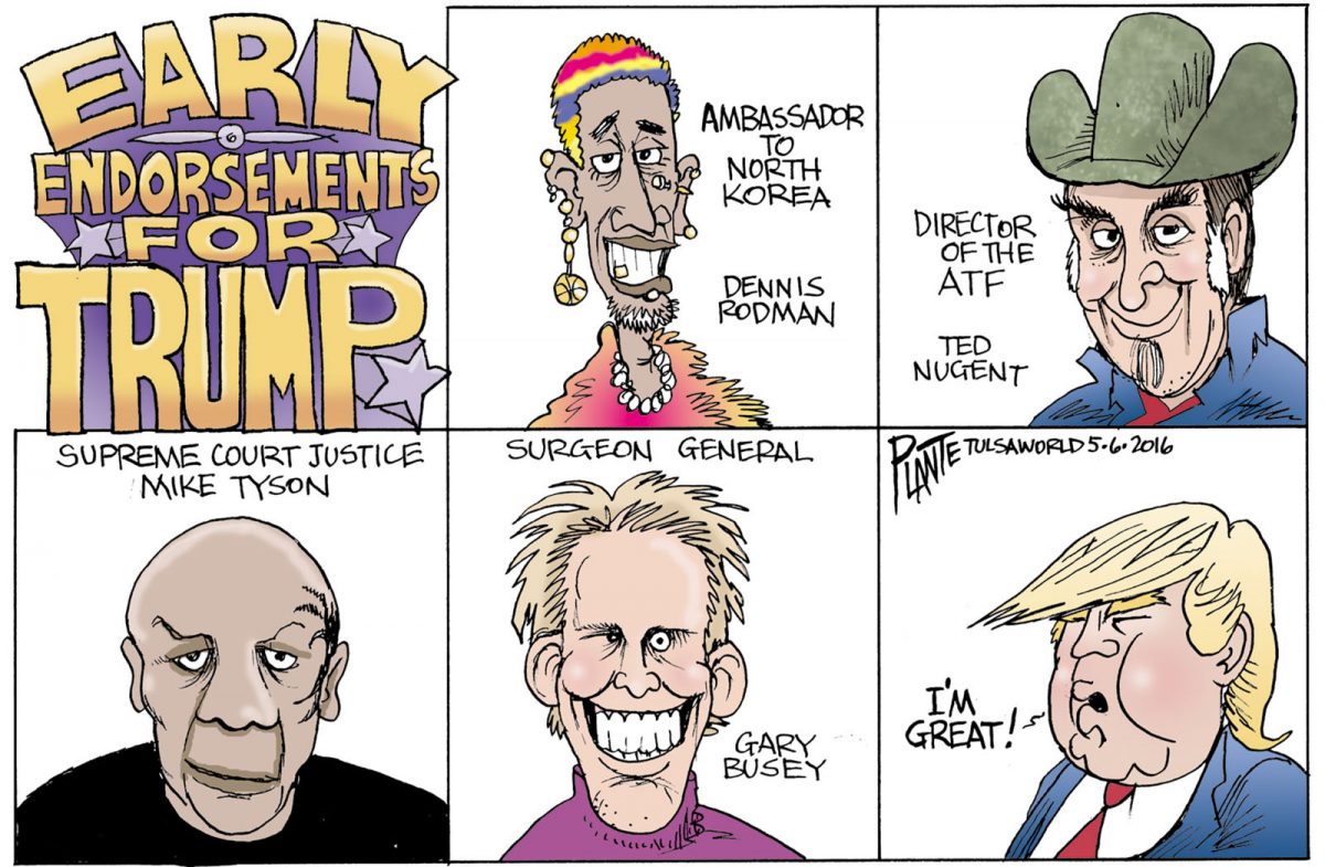 Trump endorsements so far,Trump endorsements so far, Donald J. Trump, Republican Nominee for President of the United States, GOP, RNC, Republican National Committee, Dennis Rodman, Ted Nugent, Mike Tyson, Gary Busey, Mazeppa, Plante 20160508